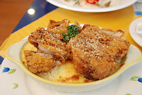老婆點的微辣香酥脆皮雞腿排焗烤飯...(南瓜白醬)~南瓜焗烤飯上面鋪著炸雞腿排, 我還第一次看過這種焗烤吃法哩~