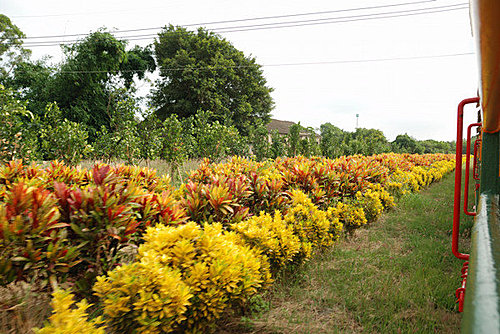 五分車來回一趟約莫40分鐘, 到達終點休息站時會休息10分鐘讓遊客買買東西, 沿途可以欣賞窗外的田園風光... 這是其中一段擁有不同鮮豔顏色葉子的植物, 忘了叫什麼名字了~ 還蠻漂亮的哩~