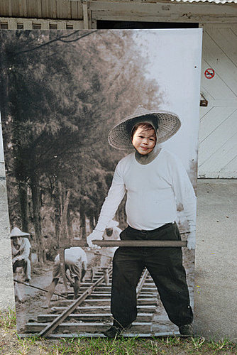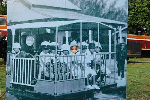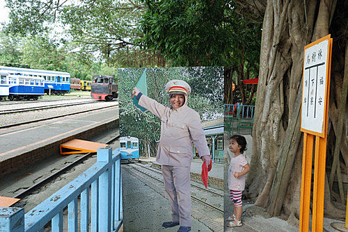 坐完五分車就在園區內到處逛逛, 園區內有放置一些由懷舊相片放大製作的人型看板, 小公主覺得新奇又有趣, 每一塊看板都要去試試~ 呵呵~ 這一張是以前的小朋友坐火車去上課~