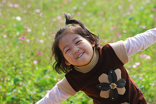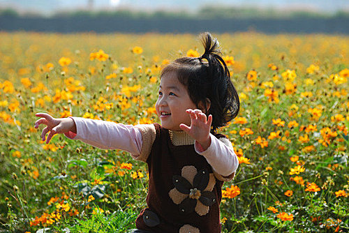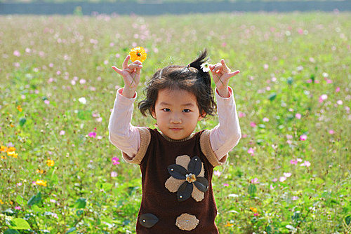 耶~? 妳什麼時候偷摘了兩朵花呀? 說是要回家送給奶奶的~哈~